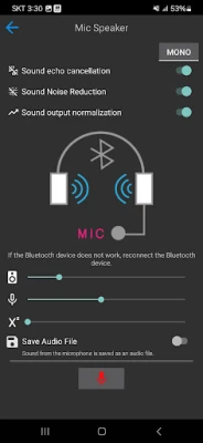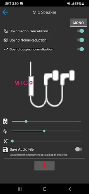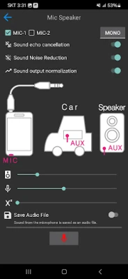 The microphone speaker app can connect the AUX cable with another audio device to output the smartphone's microphone output to the audio device.