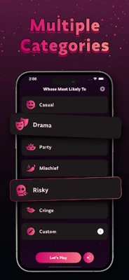 → 6 Different Categories: Whether you want to play Most Likely To with friends, colleagues, or one-on-one with someone you have met on a dating app, there are different categories of questions for all kinds of players, and for all scenarios!